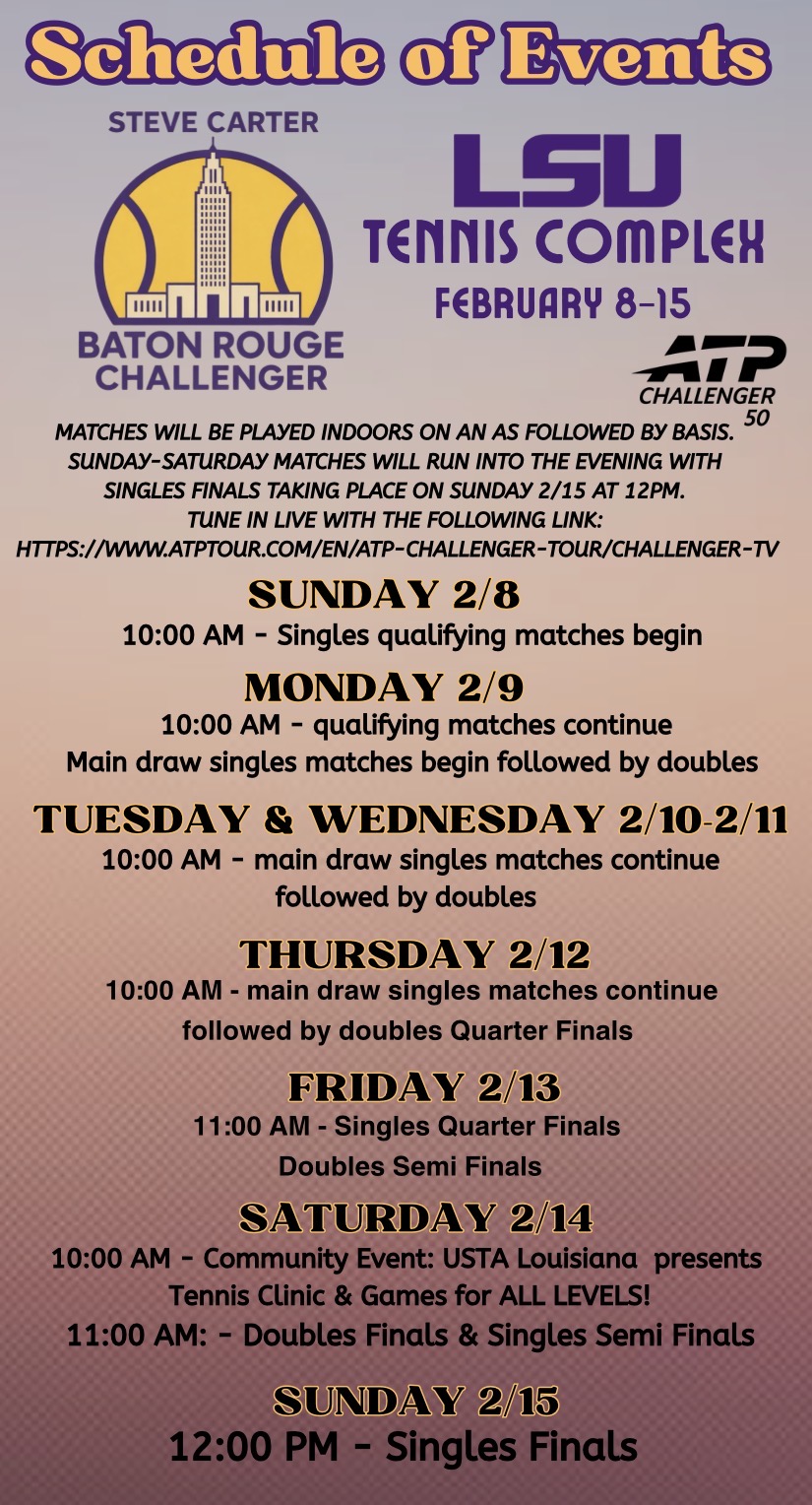 BATON ROUGE, La – For the first time, the ATP Challenger Tour is coming to Baton Rouge. Courtesy of Team E, the Steve Carter Baton Rouge ATP Challenger will be held at the LSU Tennis Complex from Feb. 8-15, 2026.